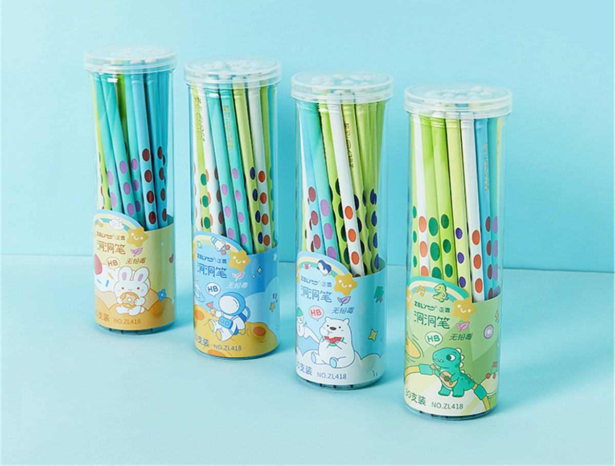 Los lápices están decorados con ilustraciones temáticas y divertidas que incluyen un conejito astronauta y otros personajes cartoon, lo que los hace muy atractivos para estudiantes. Son un recurso excelente para la caligrafía y para asegurar una experiencia de escritura segura y cómoda.