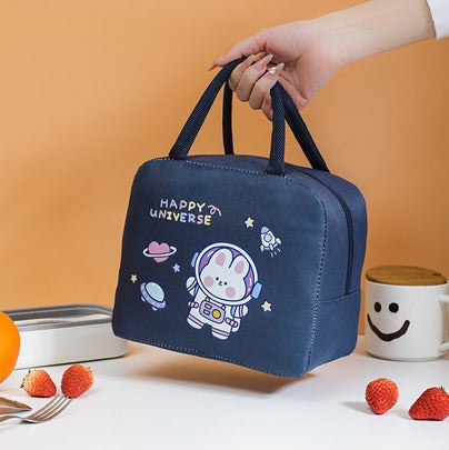 Este adorable bolso de almuerzo es perfecto para llevar comidas, snacks y bebidas a la escuela, la oficina o para un picnic. Cuenta con un diseño divertido y moderno con un conejo astronauta y motivos espaciales, incluyendo planetas y cohetes. El interior está forrado con un material térmico que ayuda a mantener la temperatura de los alimentos, ya sea fríos o calientes, por un tiempo prolongado. El bolso es ligero, tiene un cierre de cremallera superior y asas de transporte resistentes para un fácil manejo.