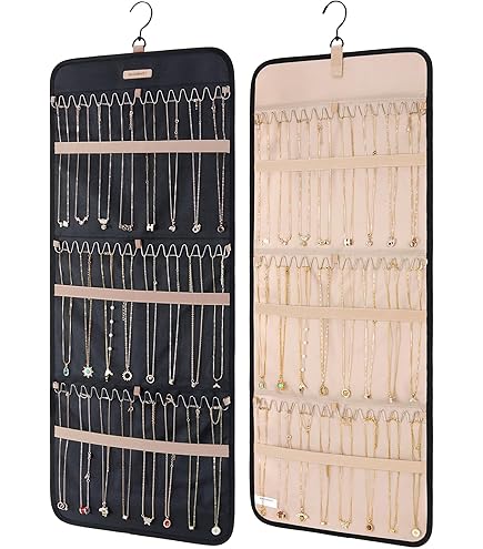 Un lado del organizador cuenta con múltiples bolsillos de material transparente que te permiten ver rápidamente el contenido (pendientes y anillos). El lado opuesto cuenta con cintas y tiras diseñadas específicamente para sujetar y organizar collares y cadenas, manteniéndolos rectos y listos para usar. Se cuelga fácilmente en la barra del armario o en la pared gracias a su gancho superior.