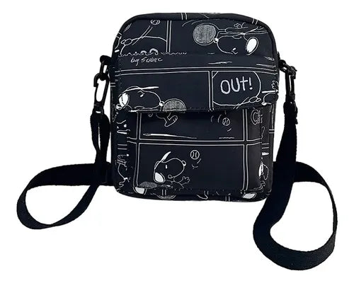 Esta bandolera es un accesorio perfecto para los fans del universo Peanuts, con un diseño moderno que utiliza gráficos de tiras cómicas en blanco y negro. El estampado presenta a Snoopy en diversas poses de juego y acción, creando un estilo dinámico y nostálgico.