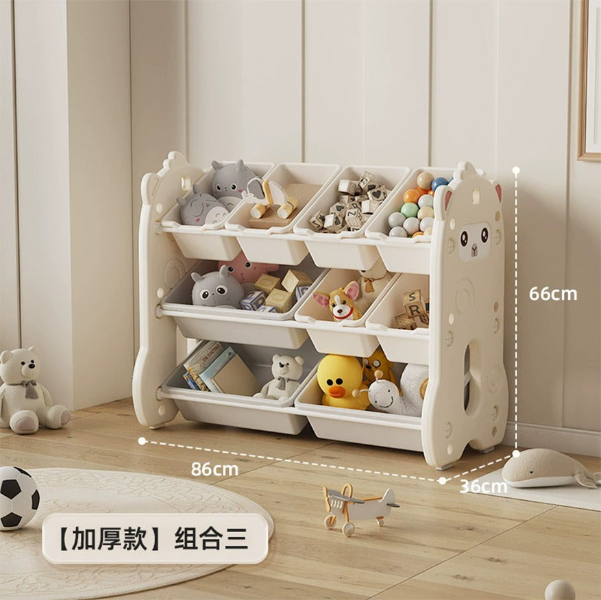Este organizador de juguetes es una solución práctica para mantener ordenados los espacios infantiles. Su diseño incorpora contenedores extraíbles e inclinados que facilitan a los niños ver y alcanzar sus juguetes por sí mismos. Esto promueve la responsabilidad y autonomía en el juego y el orden.